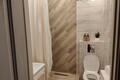 Ванная комната со средствами для душа, стиральная машинка.